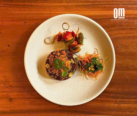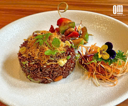 Cơm Chiên Gạo Lứt Huyết Rồng Nấm Nướng – Món ngon thanh đạm, dinh dưỡng đỉnh cao chỉ có tại Nhà Hàng Chay OM Eatery! / Dragon Blood Brown Rice Stir-Fried with Grilled Mushrooms – A Wholesome and Nutrient-Packed Delight, Exclusively at OM Eatery Vegetarian Restaurant!