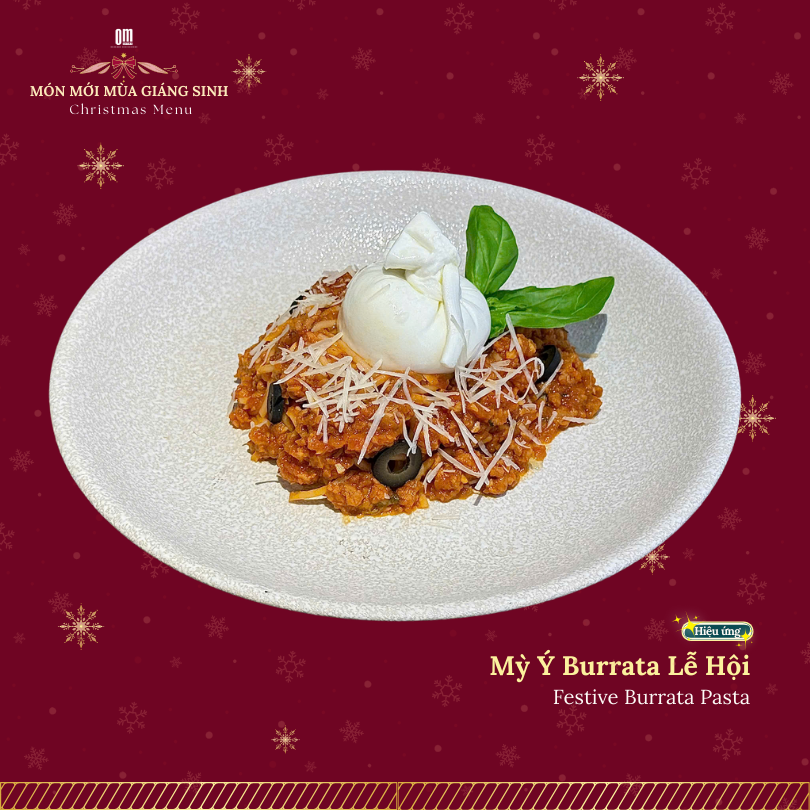 Điểm nhấn của set menu với phần sốt đậm vị, phô mai burrata béo mịn tan chảy, kết hợp cùng húng quế tươi và phô mai sợi. Từng sợi mì quyện trong lớp sốt sánh mượt, cân bằng hài hòa giữa béo – thơm – chua – ngọt, gợi lên trọn vẹn tinh thần ẩm thực lễ hội sang trọng và ấm cúng.
