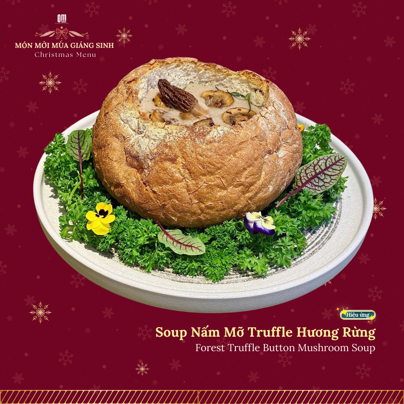 Món khai vị mở đầu đầy cuốn hút với bánh mì nướng giòn bên ngoài, ruột mềm bên trong, trau chuốt ôm trọn phần súp nấm mỡ sánh mịn quyện cùng hương truffle đặc trưng. Vị béo nhẹ, thơm sâu, lan tỏa ấm áp ngay từ thìa đầu tiên – như lời chào dịu dàng của mùa đông giữa không gian Giáng Sinh an yên.