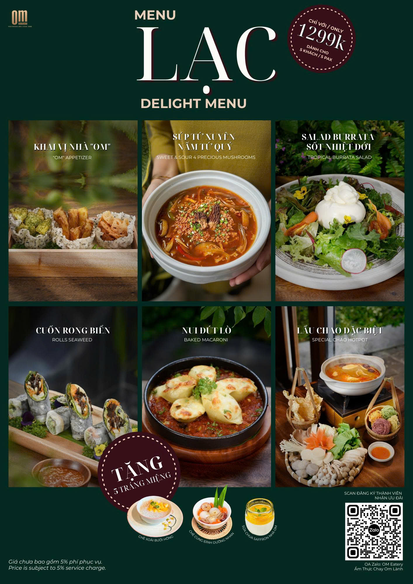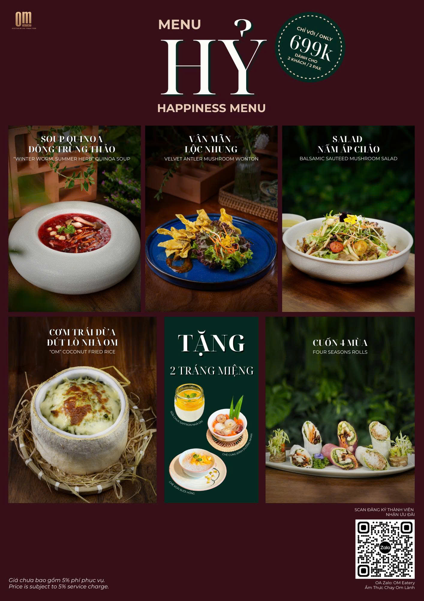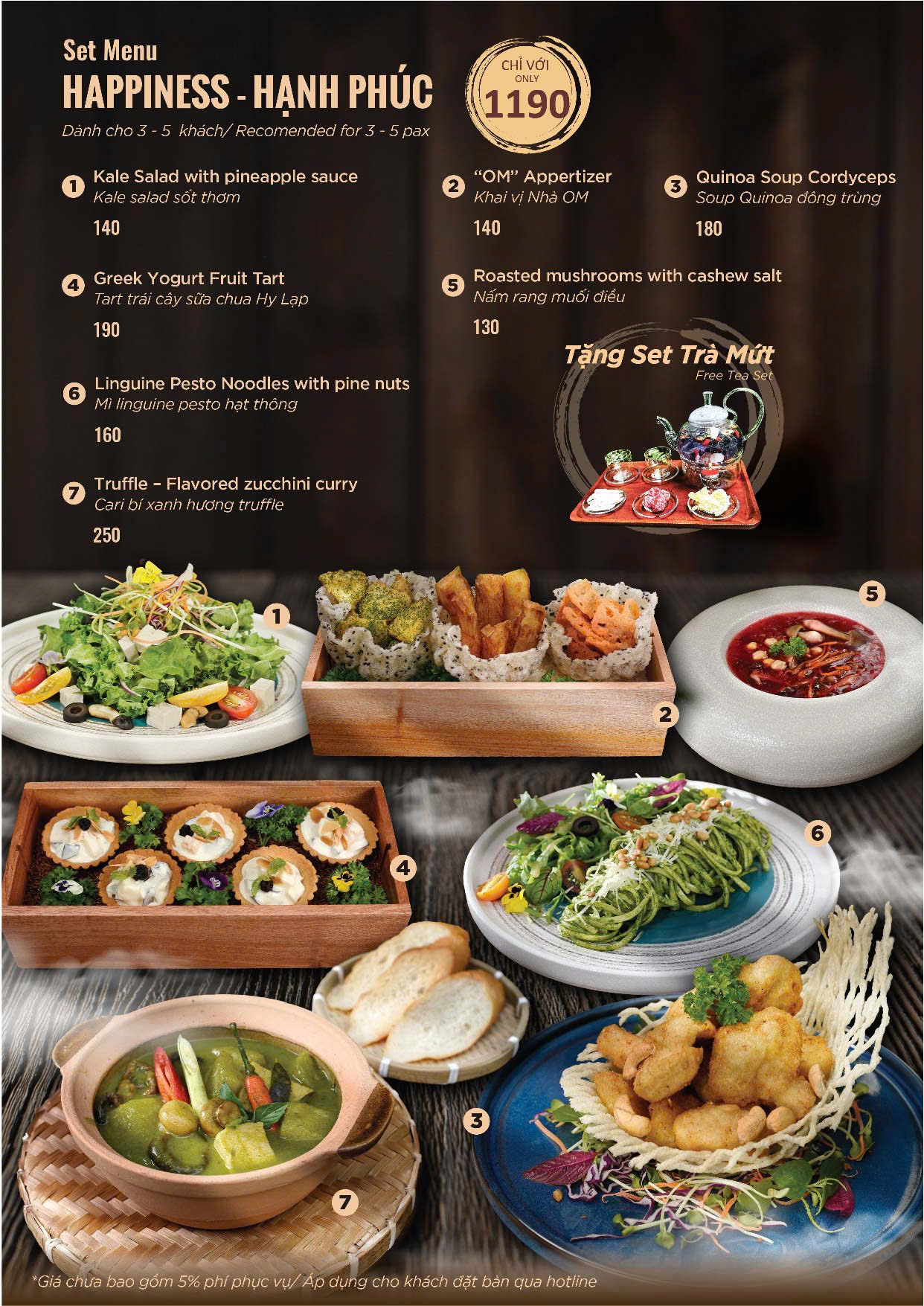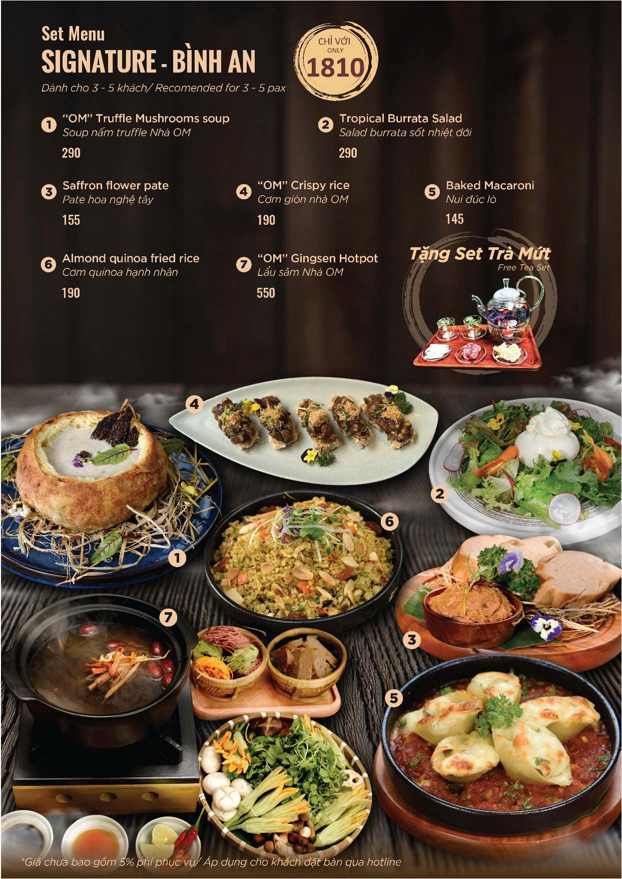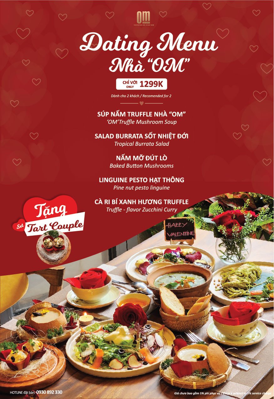 Set menu được Bếp Trưởng thiết kế dành cho nhóm khách từ 3 - 6 khách. Chọn lọc các món ăn đặc trưng của OM Eatery. Kết hợp các món ăn Á và Âu. Menu được tặng Set Trà Mứt.